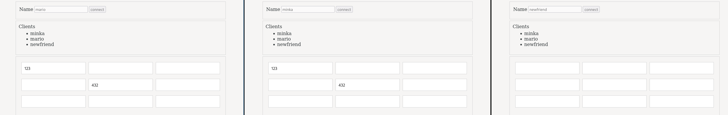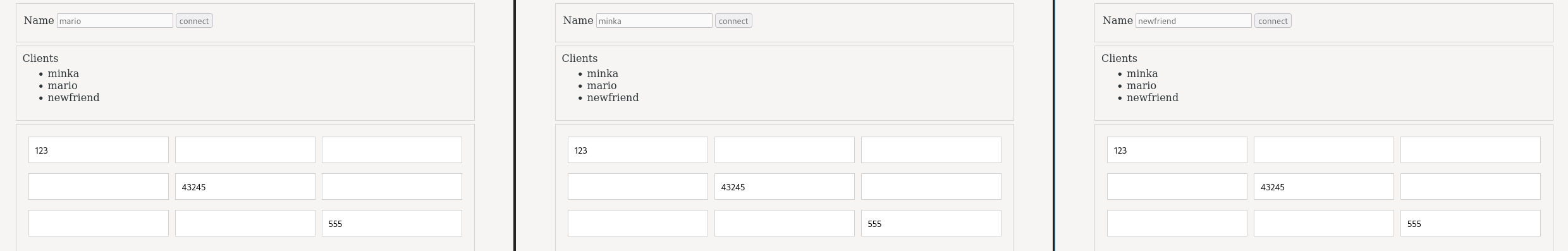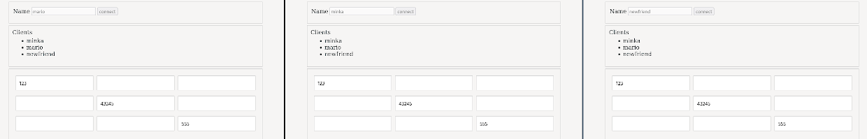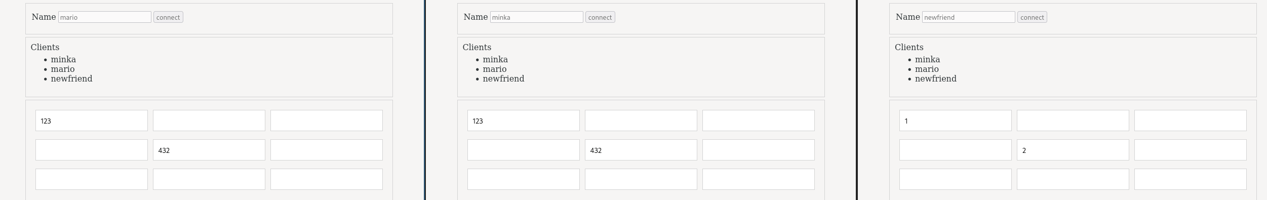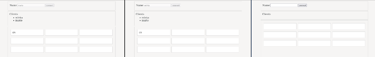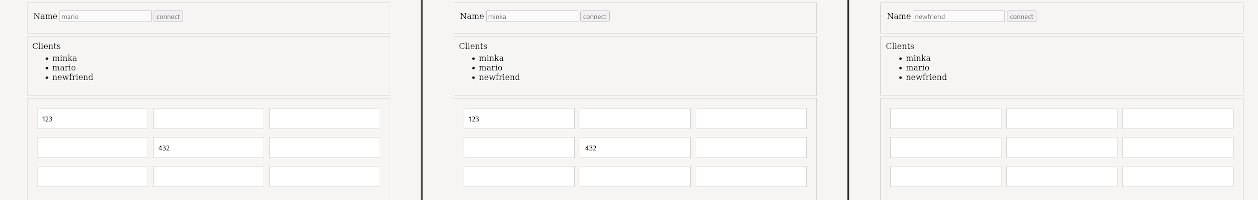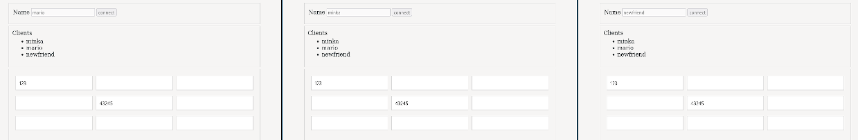 We can run the server using cargo run and the client using trunk serve --open, which will open a browser window with http://127.0.0.1:8080. We can open two more browser windows with that address, so we can simulate three different clients.
