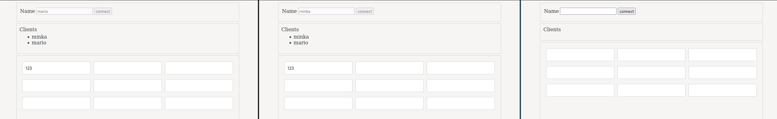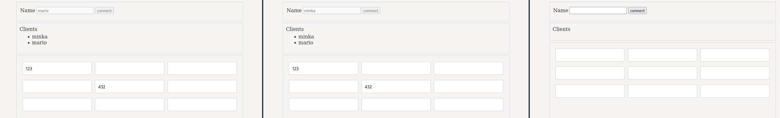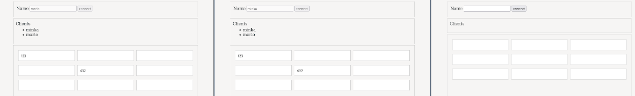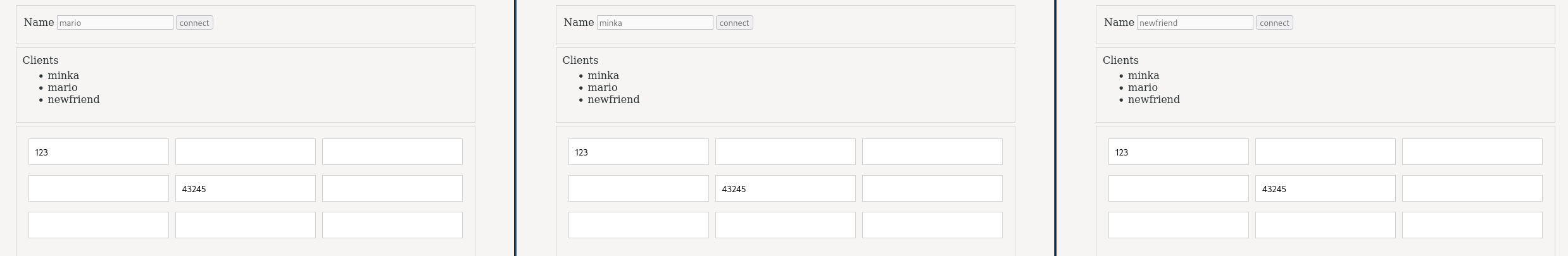 We can run the server using cargo run and the client using trunk serve --open, which will open a browser window with http://127.0.0.1:8080. We can open two more browser windows with that address, so we can simulate three different clients.