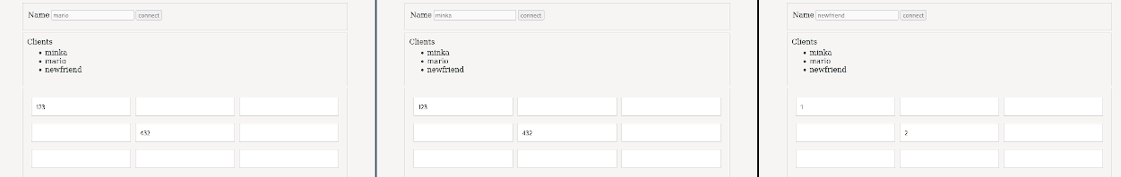 If the third client writes one character in 0:0 and one character in 1:1, nothing happens for the other clients because the local timestamp of the third client is lower than the timestamps of the first and second clients.